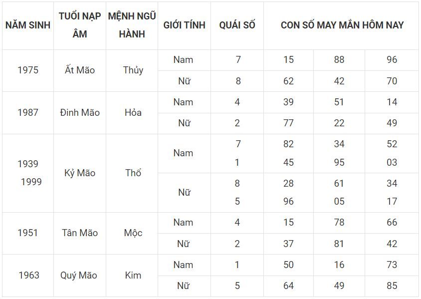 Tuổi Mão trong 12 con giáp được đại diện cho sự nhanh nhẹn có tài tính toán nhìn xa trông rộng. Mặt khác người tuổi Mão rất nhiệt tình, họ sẵn sàng giúp đỡ những người gặp khó khăn. Ngoài ra tuổi này có khả năng thích nghi tốt với mọi hoàn cảnh, có thể chịu đựng mọi áp lực của công việc và cuộc sống. Ai người tuổi Mão thì vào xem số đẹp may mắn cho ngày mới phát tài nhé.