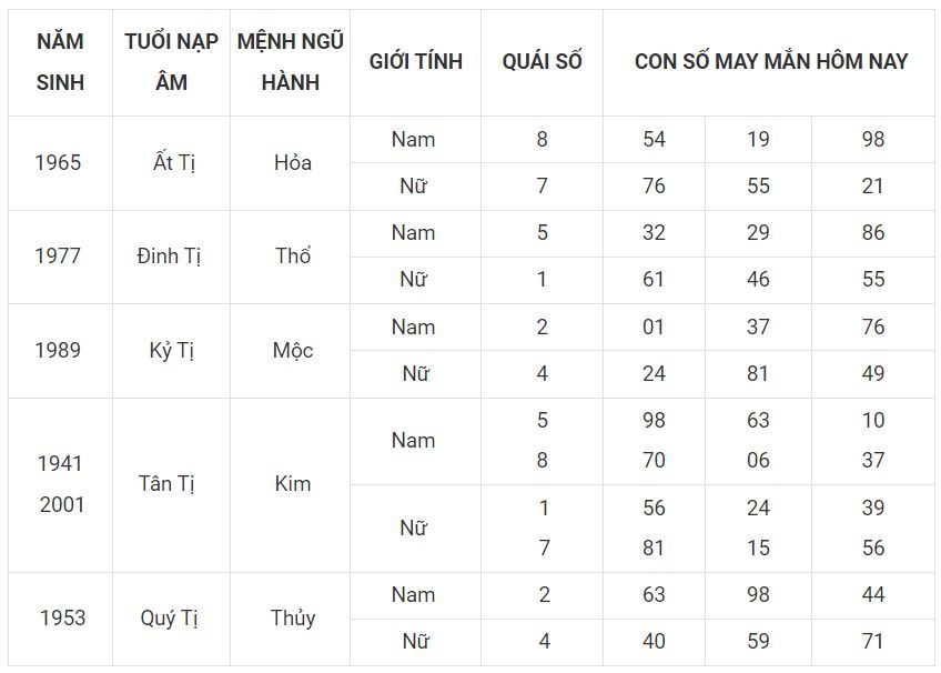 Người tuổi Tị – cầm tinh con rắn được mọi người nhận xét là người khéo léo, khôn ngoan và có tính hay mạo hiểm. Ngoài ra họ có tính giàu tình cảm và có cuộc sống nội tâm rất phong phú. Với tính lãng mạn và sự uyển chuyển người tuổi Tị luôn khiến mọi người bị thu hút. Bạn có đang tò mò số đẹp hôm nay của tuổi Tị hay không, cùng xem nhé!