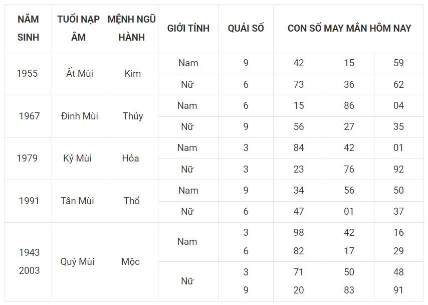 Tuổi Mùi – cầm tinh con dê trong 12 con Giáp được đánh giá là con vật đại diện cho người tốt bụng và nhân hậu. Họ có cuộc sống nhiều tình cảm, luôn sẵn sàng giúp đỡ mọi người xung quanh. Đặc biệt hơn, người tuổi Mùi rất thông minh với tài trí hơn người, họ có tài nhìn xa trông rộng và khả năng phân tích vấn đề rất nhạy bén. Cho dù là tuổi gì thì tất cả chúng ta cũng cần đến nhiều may mắn, cùng xem son số may mắn hôm nay 11-4-2023 của tuổi Mùi ứng với số nào?
