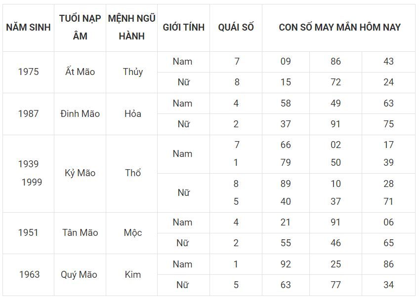 Tuổi Mão trong 12 con giáp được đại diện cho sự nhanh nhẹn có tài tính toán nhìn xa trông rộng. Mặt khác người tuổi Mão rất nhiệt tình, họ sẵn sàng giúp đỡ những người gặp khó khăn. Ngoài ra tuổi này có khả năng thích nghi tốt với mọi hoàn cảnh, có thể chịu đựng mọi áp lực của công việc và cuộc sống. Ai người tuổi Mão thì vào xem số đẹp may mắn cho ngày mới phát tài nhé.