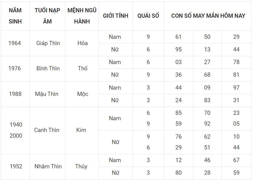 - Nhâm Thìn 1952 – Rồng làm mưa (thuộc mệnh Thủy trong Ngũ hành).