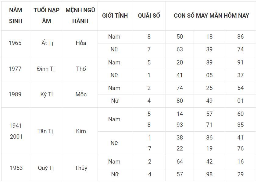 Người tuổi Tị – cầm tinh con rắn được mọi người nhận xét là người khéo léo, khôn ngoan và có tính hay mạo hiểm. Ngoài ra họ có tính giàu tình cảm và có cuộc sống nội tâm rất phong phú. Với tính lãng mạn và sự uyển chuyển người tuổi Tị luôn khiến mọi người bị thu hút. Bạn có đang tò mò số đẹp hôm nay của tuổi Tị hay không, cùng xem nhé!