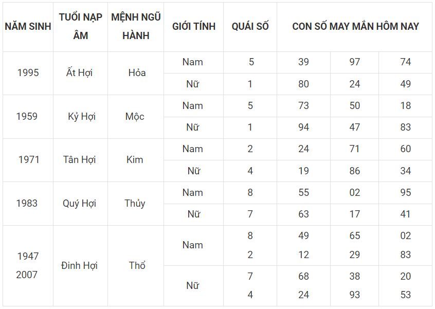 - Tuổi Đinh Hợi sinh năm 1947, 2007 (mệnh Thổ): Nhận được sự giúp đỡ khi đối diện với những rắc rối bất ngờ, công việc suôn sẻ.