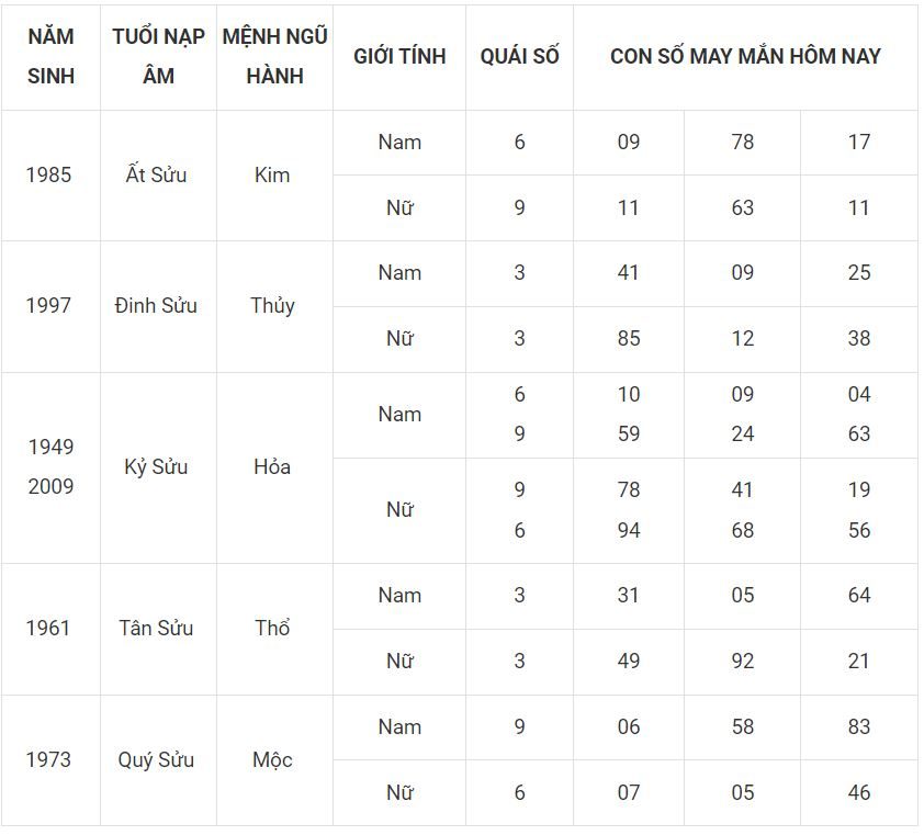 Tuổi Sửu – Trâu được đánh giá là con vật thật thà, chất phát, cần cù, chăm chỉ và độ nhẫn nhịn cao. Người tuổi Sửu có chính kiến riêng, họ không bị lung lay trước nhiều luồng ý kiến hoặc tình cảm. Ngoài ra tuổi Sửu còn đại diện cho sức mạnh về thể chất lẫn tình thần. Thêm vào đó, người tuổi này đa số có cuộc sống tự lập, họ trưởng thành và có tình cách rất mạnh mẽ kiên định. Người tuổi Sửu có nhiều ước mơ, hoài bão, ý chí, họ không ngại khó khăn và nguy hiểm. Cùng tìm hiểu xem người tuổi con Trâu phát lộc với con số may mắn nào trong hôm nay.
