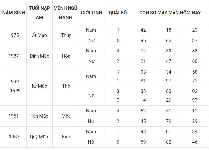 Tuổi Mão trong 12 con giáp được đại diện cho sự nhanh nhẹn có tài tính toán nhìn xa trông rộng. Mặt khác người tuổi Mão rất nhiệt tình, họ sẵn sàng giúp đỡ những người gặp khó khăn. Ngoài ra tuổi này có khả năng thích nghi tốt với mọi hoàn cảnh, có thể chịu đựng mọi áp lực của công việc và cuộc sống. Ai người tuổi Mão thì vào xem số đẹp may mắn cho ngày mới phát tài nhé.