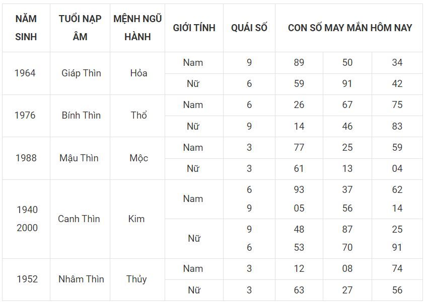 - Nhâm Thìn 1952 – Rồng làm mưa (thuộc mệnh Thủy trong Ngũ hành).