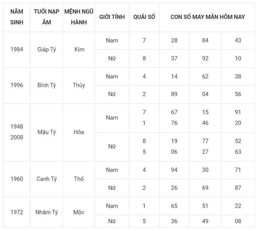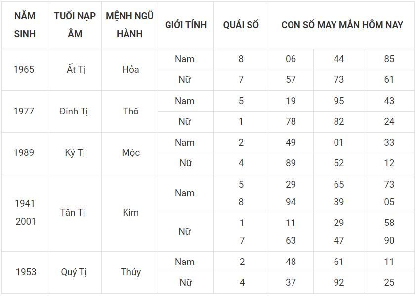 Người tuổi Tị – cầm tinh con rắn được mọi người nhận xét là người khéo léo, khôn ngoan và có tính hay mạo hiểm. Ngoài ra họ có tính giàu tình cảm và có cuộc sống nội tâm rất phong phú. Với tính lãng mạn và sự uyển chuyển người tuổi Tị luôn khiến mọi người bị thu hút. Bạn có đang tò mò số đẹp hôm nay của tuổi Tị hay không, cùng xem nhé!
