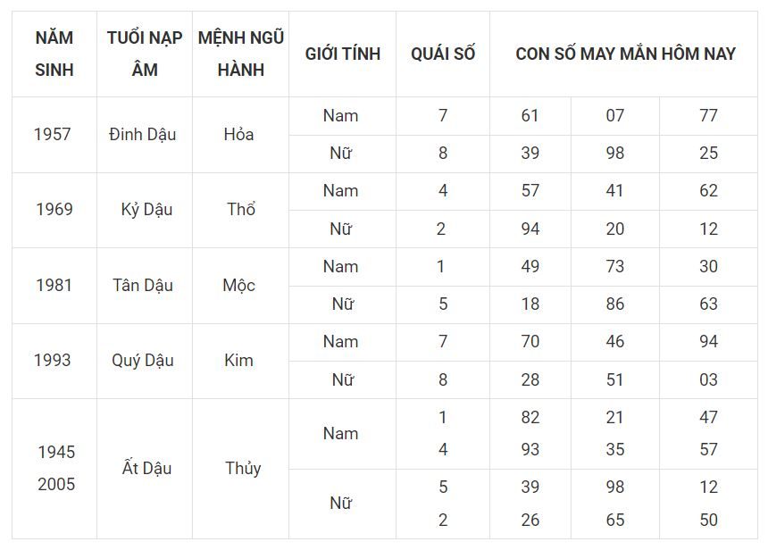 Tuổi Dậu trong 12 con giáp được đại diện cho sự năng động, nhiệt tình và kiêu hãnh. Bởi vậy người mang tuổi Dậu luôn yêu đời và có cuộc sống tràn đầy năng lượng. Có tinh thần trách nhiệm cao và tính tình ngay thẳng nên họ luôn được nhiều người yêu quý. Số may đại cát ứng với người tuổi gà sẽ được hé lộ ngay bên dưới.