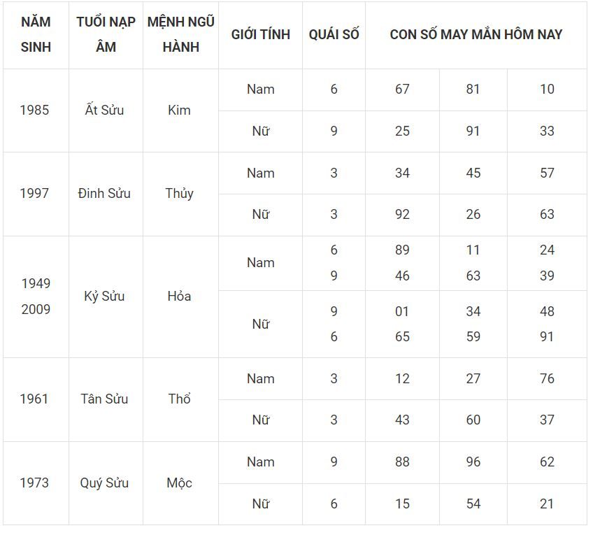 Tuổi Sửu – Trâu được đánh giá là con vật thật thà, chất phát, cần cù, chăm chỉ và độ nhẫn nhịn cao. Người tuổi Sửu có chính kiến riêng, họ không bị lung lay trước nhiều luồng ý kiến hoặc tình cảm. Ngoài ra tuổi Sửu còn đại diện cho sức mạnh về thể chất lẫn tình thần. Thêm vào đó, người tuổi này đa số có cuộc sống tự lập, họ trưởng thành và có tình cách rất mạnh mẽ kiên định. Người tuổi Sửu có nhiều ước mơ, hoài bão, ý chí, họ không ngại khó khăn và nguy hiểm. Cùng tìm hiểu xem người tuổi con Trâu phát lộc với con số may mắn nào trong hôm nay.