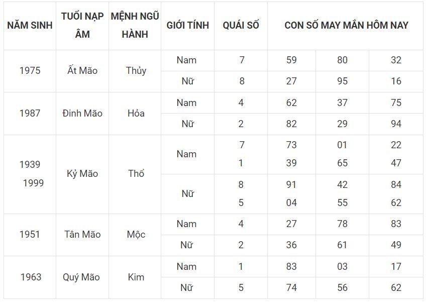 Tuổi Mão trong 12 con giáp được đại diện cho sự nhanh nhẹn có tài tính toán nhìn xa trông rộng. Mặt khác người tuổi Mão rất nhiệt tình, họ sẵn sàng giúp đỡ những người gặp khó khăn. Ngoài ra tuổi này có khả năng thích nghi tốt với mọi hoàn cảnh, có thể chịu đựng mọi áp lực của công việc và cuộc sống. Ai người tuổi Mão thì vào xem số đẹp may mắn cho ngày mới phát tài nhé.