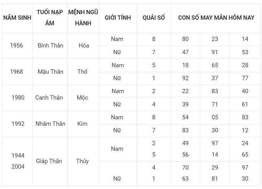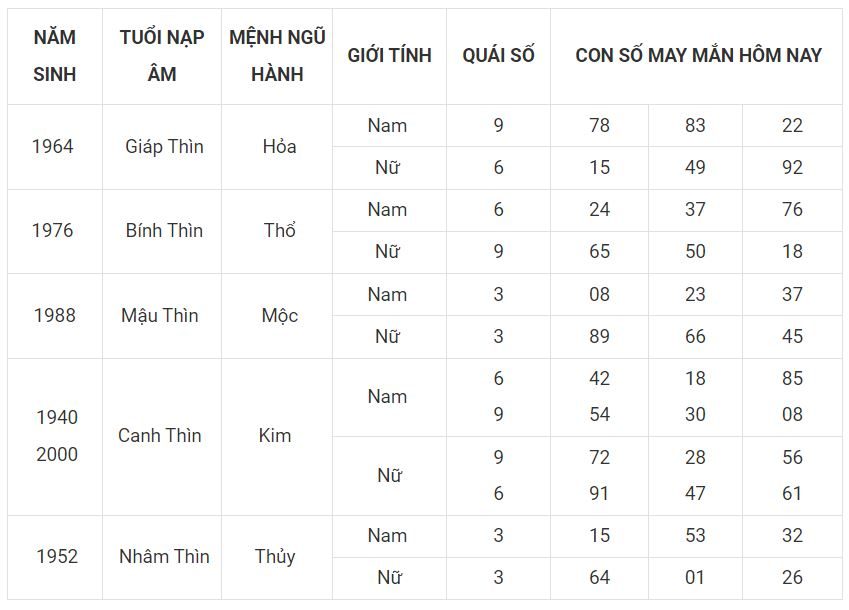 - Nhâm Thìn 1952 – Rồng làm mưa (thuộc mệnh Thủy trong Ngũ hành).