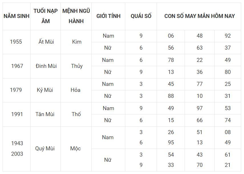 Tuổi Mùi – cầm tinh con dê trong 12 con Giáp được đánh giá là con vật đại diện cho người tốt bụng và nhân hậu. Họ có cuộc sống nhiều tình cảm, luôn sẵn sàng giúp đỡ mọi người xung quanh. Đặc biệt hơn, người tuổi Mùi rất thông minh với tài trí hơn người, họ có tài nhìn xa trông rộng và khả năng phân tích vấn đề rất nhạy bén. Cho dù là tuổi gì thì tất cả chúng ta cũng cần đến nhiều may mắn, cùng xem son số may mắn hôm nay 15-4-2023 của tuổi Mùi ứng với số nào?