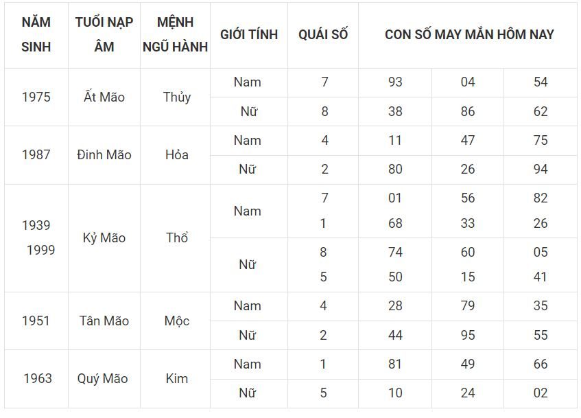 Tuổi Mão trong 12 con giáp được đại diện cho sự nhanh nhẹn có tài tính toán nhìn xa trông rộng. Mặt khác người tuổi Mão rất nhiệt tình, họ sẵn sàng giúp đỡ những người gặp khó khăn. Ngoài ra tuổi này có khả năng thích nghi tốt với mọi hoàn cảnh, có thể chịu đựng mọi áp lực của công việc và cuộc sống. Ai người tuổi Mão thì vào xem số đẹp may mắn cho ngày mới phát tài nhé.