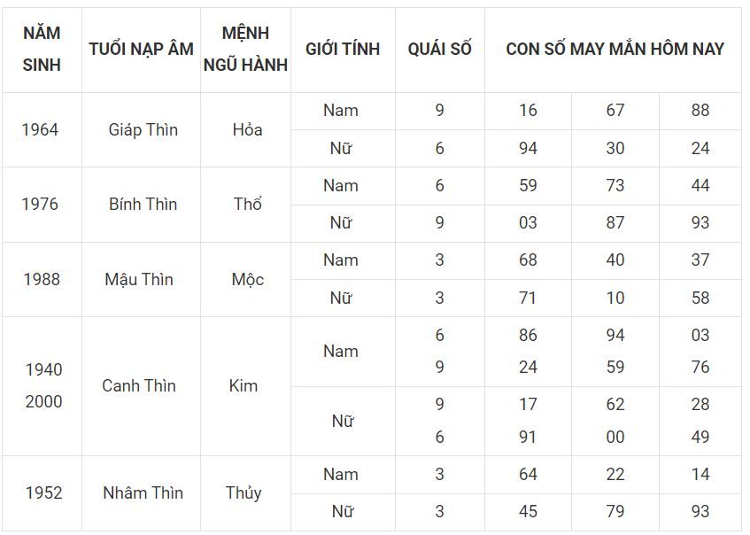 - Nhâm Thìn 1952 – Rồng làm mưa (thuộc mệnh Thủy trong Ngũ hành).