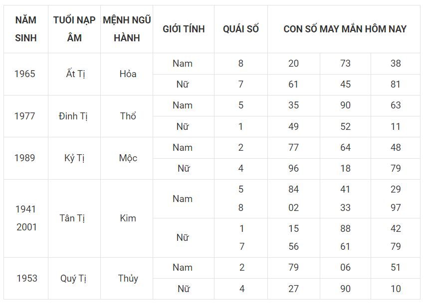 Người tuổi Tị – cầm tinh con rắn được mọi người nhận xét là người khéo léo, khôn ngoan và có tính hay mạo hiểm. Ngoài ra họ có tính giàu tình cảm và có cuộc sống nội tâm rất phong phú. Với tính lãng mạn và sự uyển chuyển người tuổi Tị luôn khiến mọi người bị thu hút. Bạn có đang tò mò số đẹp hôm nay của tuổi Tị hay không, cùng xem nhé!