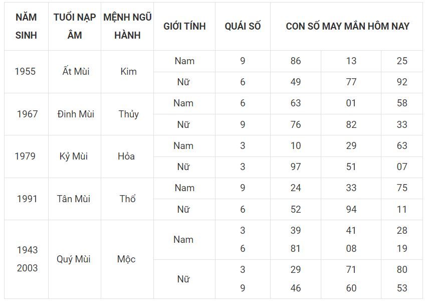 Tuổi Mùi – cầm tinh con dê trong 12 con Giáp được đánh giá là con vật đại diện cho người tốt bụng và nhân hậu. Họ có cuộc sống nhiều tình cảm, luôn sẵn sàng giúp đỡ mọi người xung quanh. Đặc biệt hơn, người tuổi Mùi rất thông minh với tài trí hơn người, họ có tài nhìn xa trông rộng và khả năng phân tích vấn đề rất nhạy bén. Cho dù là tuổi gì thì tất cả chúng ta cũng cần đến nhiều may mắn, cùng xem son số may mắn hôm nay 29-3-2023 của tuổi Mùi ứng với số nào?