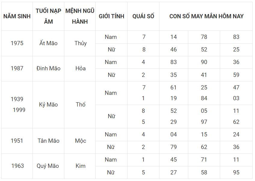 Tuổi Mão trong 12 con giáp được đại diện cho sự nhanh nhẹn có tài tính toán nhìn xa trông rộng. Mặt khác người tuổi Mão rất nhiệt tình, họ sẵn sàng giúp đỡ những người gặp khó khăn. Ngoài ra tuổi này có khả năng thích nghi tốt với mọi hoàn cảnh, có thể chịu đựng mọi áp lực của công việc và cuộc sống. Ai người tuổi Mão thì vào xem số đẹp may mắn cho ngày mới phát tài nhé.