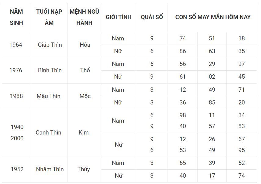 - Nhâm Thìn 1952 – Rồng làm mưa (thuộc mệnh Thủy trong Ngũ hành).