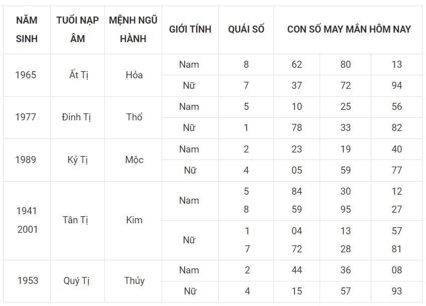 Người tuổi Tị – cầm tinh con rắn được mọi người nhận xét là người khéo léo, khôn ngoan và có tính hay mạo hiểm. Ngoài ra họ có tính giàu tình cảm và có cuộc sống nội tâm rất phong phú. Với tính lãng mạn và sự uyển chuyển người tuổi Tị luôn khiến mọi người bị thu hút. Bạn có đang tò mò số đẹp hôm nay của tuổi Tị hay không, cùng xem nhé!