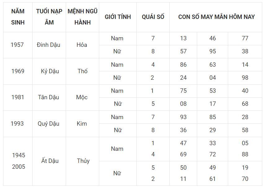 - Sinh năm Ất Dậu 1945, 2005 – Gà gáy trưa (thuộc mệnh Thủy trong Ngũ hành).