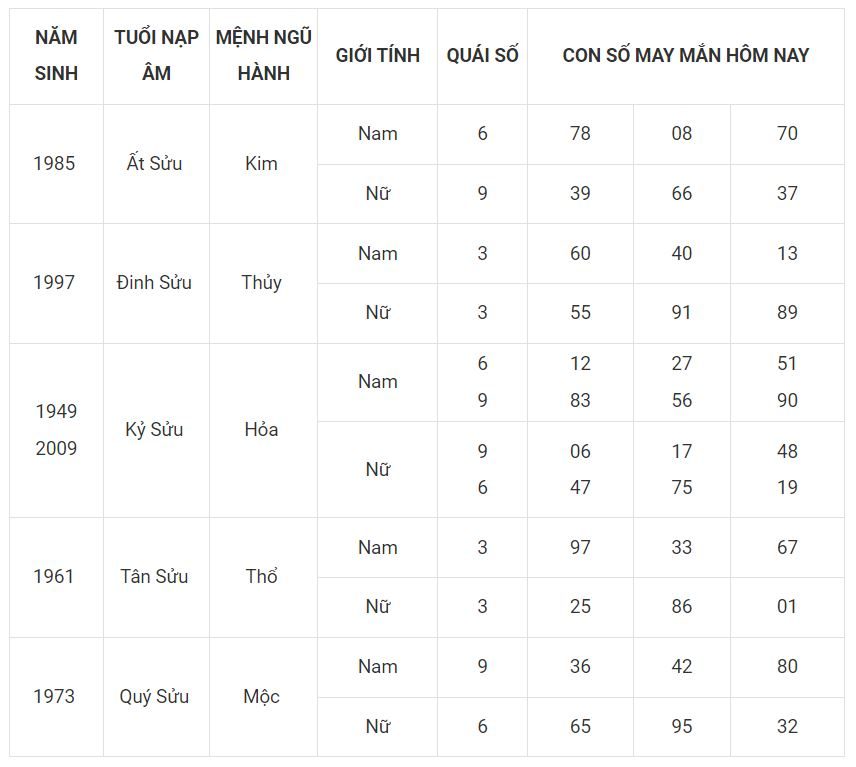 Tuổi Sửu – Trâu được đánh giá là con vật thật thà, chất phát, cần cù, chăm chỉ và độ nhẫn nhịn cao. Người tuổi Sửu có chính kiến riêng, họ không bị lung lay trước nhiều luồng ý kiến hoặc tình cảm. Ngoài ra tuổi Sửu còn đại diện cho sức mạnh về thể chất lẫn tình thần. Thêm vào đó, người tuổi này đa số có cuộc sống tự lập, họ trưởng thành và có tình cách rất mạnh mẽ kiên định. Người tuổi Sửu có nhiều ước mơ, hoài bão, ý chí, họ không ngại khó khăn và nguy hiểm. Cùng tìm hiểu xem người tuổi con Trâu phát lộc với con số may mắn nào trong hôm nay.