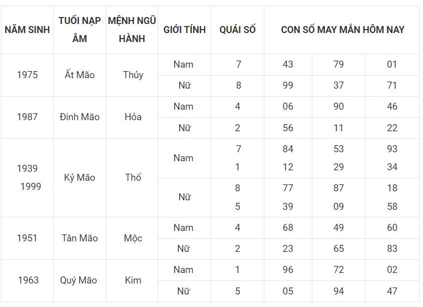 Tuổi Mão trong 12 con giáp được đại diện cho sự nhanh nhẹn có tài tính toán nhìn xa trông rộng. Mặt khác người tuổi Mão rất nhiệt tình, họ sẵn sàng giúp đỡ những người gặp khó khăn. Ngoài ra tuổi này có khả năng thích nghi tốt với mọi hoàn cảnh, có thể chịu đựng mọi áp lực của công việc và cuộc sống. Ai người tuổi Mão thì vào xem số đẹp may mắn cho ngày mới phát tài nhé.