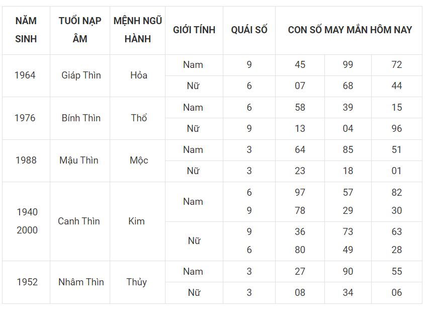 - Nhâm Thìn 1952 – Rồng làm mưa (thuộc mệnh Thủy trong Ngũ hành).