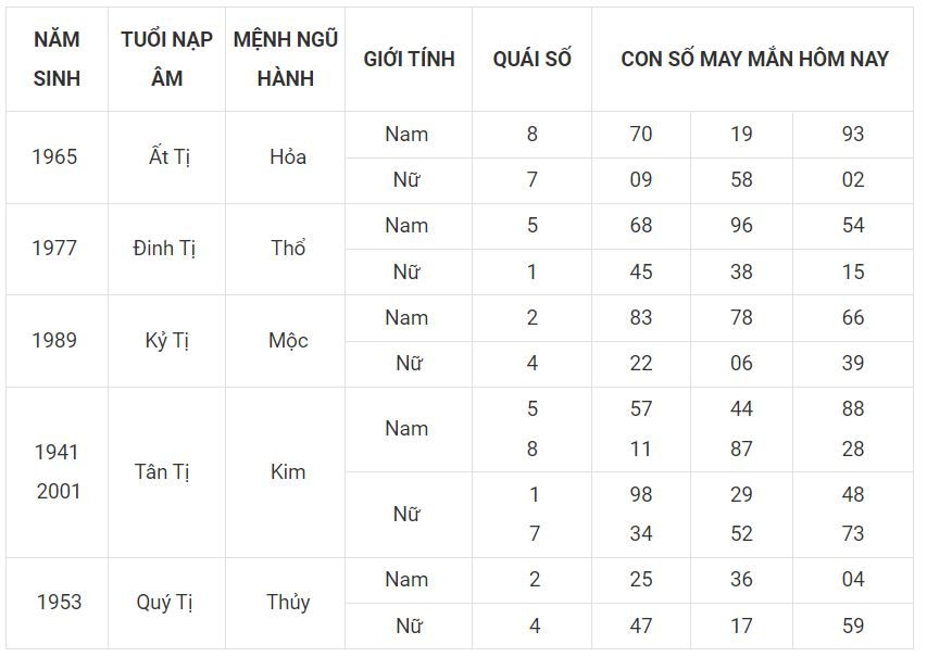 Người tuổi Tị – cầm tinh con rắn được mọi người nhận xét là người khéo léo, khôn ngoan và có tính hay mạo hiểm. Ngoài ra họ có tính giàu tình cảm và có cuộc sống nội tâm rất phong phú. Với tính lãng mạn và sự uyển chuyển người tuổi Tị luôn khiến mọi người bị thu hút. Bạn có đang tò mò số đẹp hôm nay của tuổi Tị hay không, cùng xem nhé!
