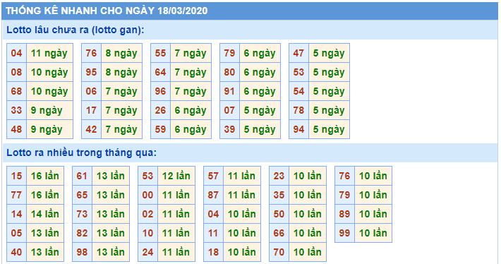 Theo dự đoán xsmb 18-3 hôm nay sẽ là 1 ngày cực kì đáng chú ý , anh em cần phải cẩn trọng với các lô gan cực đại ở bên dưới bảng thống kê , tránh những điều sơ sót ngoài ý muốn.